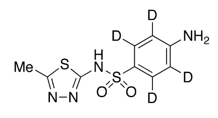 | Synonym : | 2-Methyl-5-sulfanilamido-1,3,4-thiadiazole-d4; 2-Sulfanilamido-5-methyl-1,3,4-thiadiazole-d4; 4-Amino-N-(5-methyl-[1,3,4]thiadiazol-2-yl)benzenesulfonamide-d4; 5-Methyl-2-sulfanilamido-1,3,4-thiadiazole-d4; Ayerlucil-d4; Famet-d4; Lucosil-d4; Methazol-d4; Microsul-d4; N-(5-Methyl-1,3,4-thiadiazol-2-yl)-4-aminobenzenesulfonamide-d4-d4; N1-(5-Methyl-1,3,4-thiadiazol-2-yl)sulfanilamide-d4; Renasul-d4; Rufol-d4; Salimol-d4; Sulfamethiazole-d4; Sulfamethizol-d4; Sulfamethylthiadiazole-d4; Sulfapyelon-d4; Sulfstat-d4; Sulfurine-d4; Sulphamethizole-d4; Tetracid-d4; Thidicur-d4; Thiosulfil-d4; Thiosulfil Forte-d4; Ultrasul-d4; Urocydal-d4; Urodiaton-d4; Urolucosil-d4; Urosulfin-d4; VK 53-d4; N1-(5-Methyl-1,3,4-thiadiazol-2-yl)sulfanilamide-d4; 4-Amino-N-(5-methyl-1,3,4-thiadiazol-2-yl)benzenesulfo |