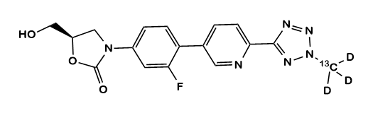 | Synonym : | (R)-3-(3-fluoro-4-(6-(2-(methyl-13C-d3)-2H-tetrazol-5-yl)pyridin-3-yl)phenyl)-5-(hydroxymethyl)oxazolidin-2-one |